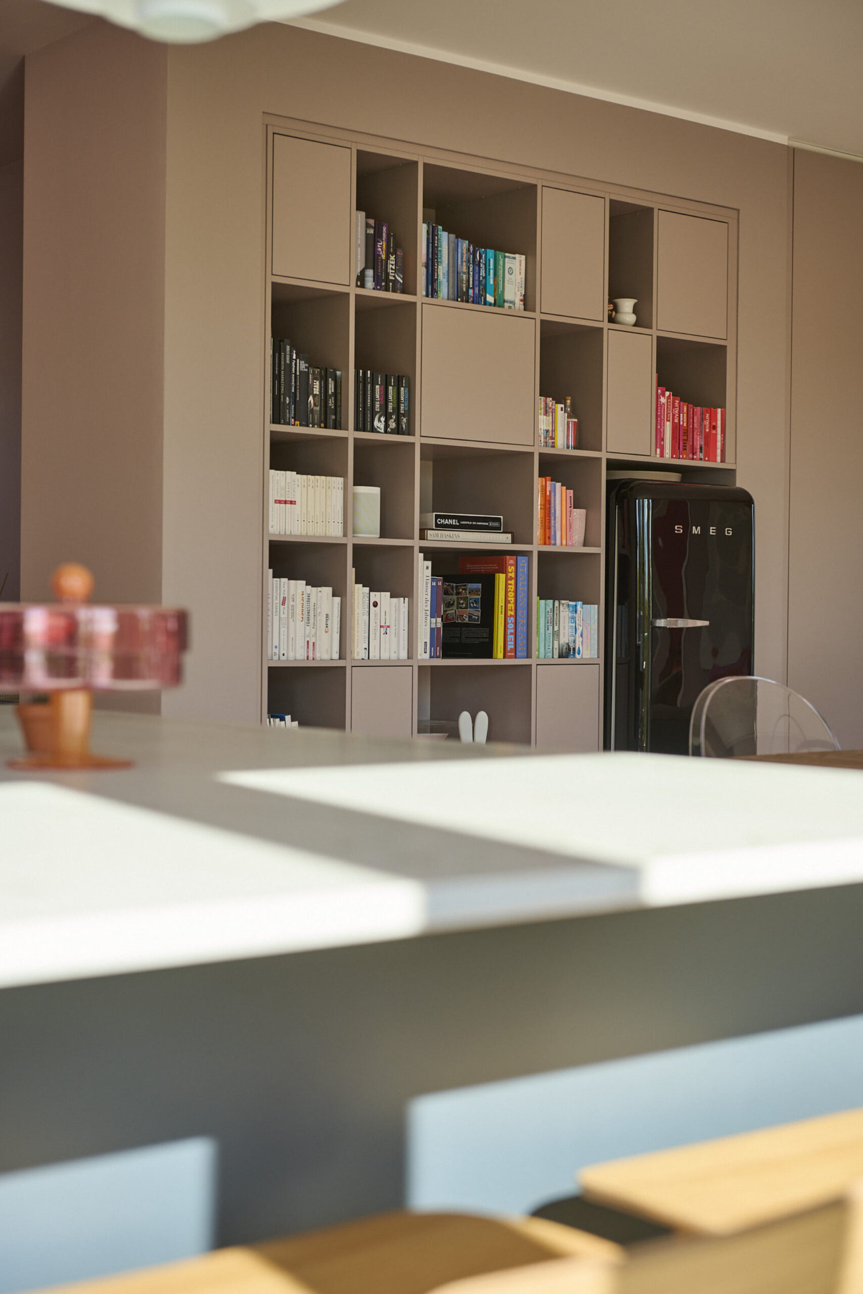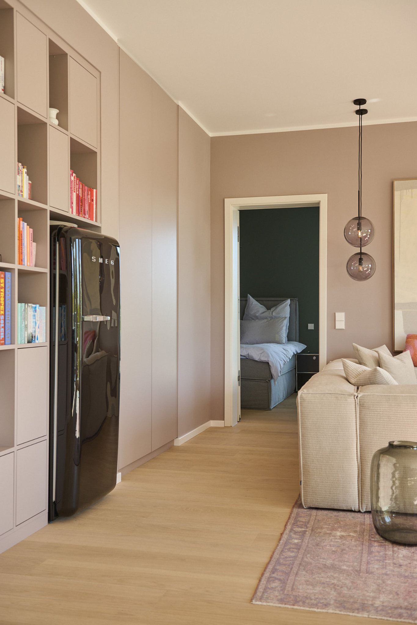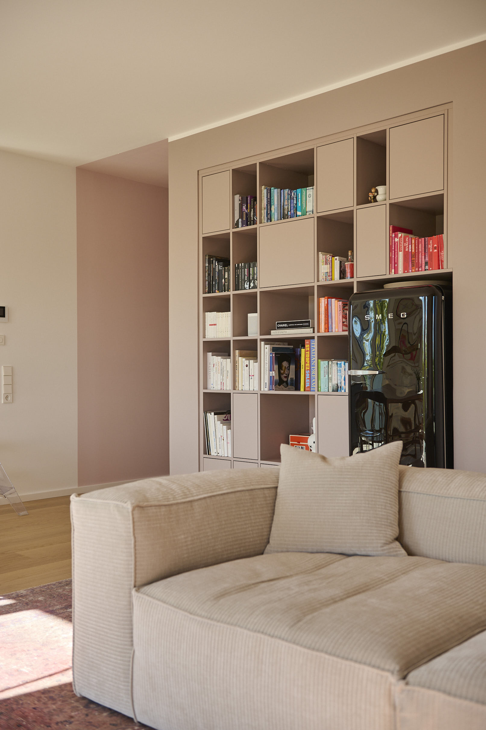 Der seidenmatte Lack in einem warmen Altrosa wurde exakt mit der Wandfarbe abgestimmt, wodurch das Möbel beinahe mit der Architektur verschmilzt und dennoch eine starke gestalterische Präsenz entfaltet. Die grifflose Ausführung und die hochwertigen Materialien unterstreichen den klaren, zeitlosen Look und verleihen dem Raum eine zurückhaltende Eleganz mit individuellem Charakter.